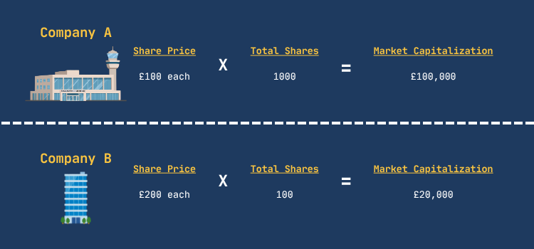 Yes, company B’s stock is more expensive to buy, but just by looking at the price we can’t say whether it is the bigger company out of the two. What we need to compare is the “market capitalisation” (commonly referred to as “market cap”):