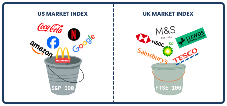 Stock indexes are a tracker of specific markets (e.g. the US market, the UK market, Asian market, etc) – it gives us an idea of how that market is performing at the moment. The most popular one, which you’ve most likely heard of, is the “S&P 500” (S&P stands for “Standard & Poor’s”, the company who created this index). This index tracks how the 500 biggest market cap companies in the US (mega corporations such as Apple, Microsoft and Google) are performing – it is often used as general indicator of how the US market is performing. So if the S&P 500 is up, then it would indicate that the US market is performing well, if it’s down then it’s the opposite. *note: indexes are regularly updated to add/remove companies. The list of companies in S&P 500 from 20 years ago will be far different than what it is today