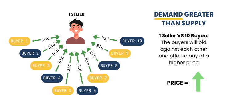 Well, the 10 buyers would need to convince you to sell it to one of them, and the way they do it would be to outbid each other by offering a higher price; buyer A might offer to buy for £110, then buyer B might offer £120, and so on and on until they reach a price where no further bids are made, e.g. £200. So because the demand was greater than supply, the price increased from £100 to £200.