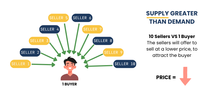 - When supply is greater than demand = the price decreases
